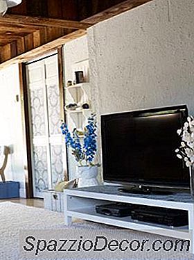 Scambiare l'unità media scura per un tavolo basso e bianco aiuta a compensare l'oscurità del soffitto in legno.