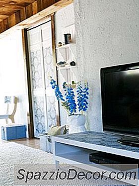 La parte superiore del tavolo TV è coperta con lo stesso sfondo utilizzato per stuoiare le cornici. È un modo sottile per creare un look coeso.
